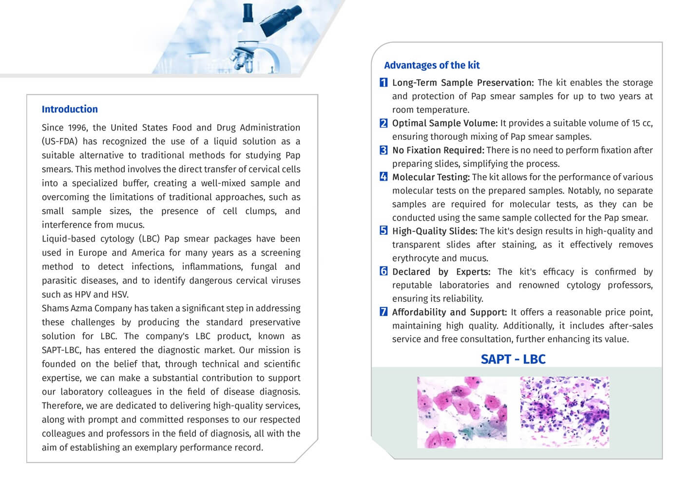 Shams Azma Company has taken a significant step in addressing these challenges by producing the standard preservative solution for LBC. The company’s LBC product, known as SAPT-LBC, has entered the diagnostic market. Our mission is founded on the belief that, through technical and scientific expertise, we can make a substantial contribution to support our laboratory colleagues in the field of disease diagnosis. Therefore, we are dedicated to delivering high-quality services, along with prompt and committed responses to our respected colleagues and professors in the field of diagnosis, all with the aim of establishing an exemplary performance record.